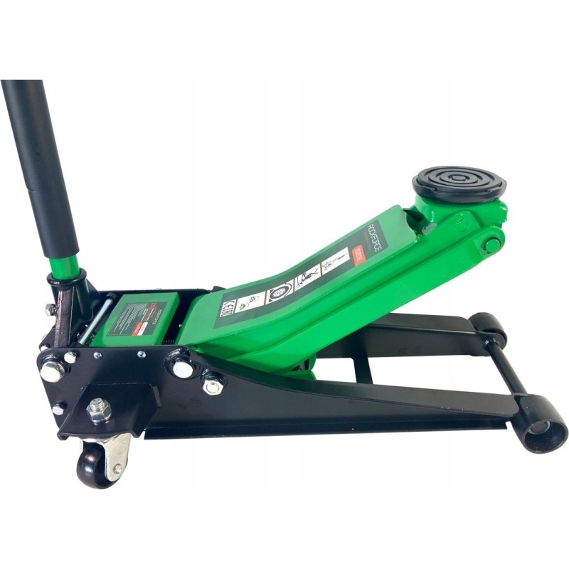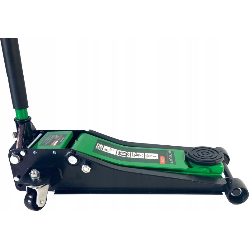 Der Wagenheber ist mit robusten Metallrädern ausgestattet, die auch bei langem Einsatz in der Werkstatt nicht unter dem Gewicht des Fahrzeugs nachgeben.