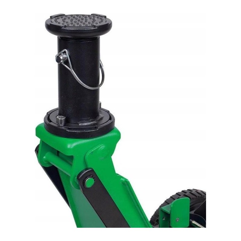 Dank der großen, nicht luftgefüllten Räder lässt sich der Wagenheber auf jedem Untergrund leicht manövrieren, sowohl auf der Straße als auch im Gelände.