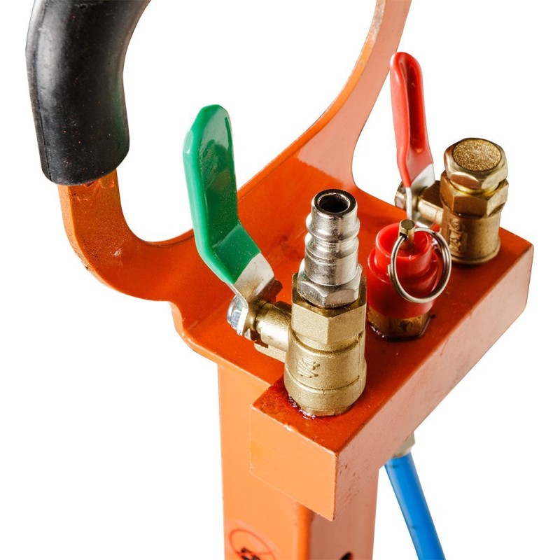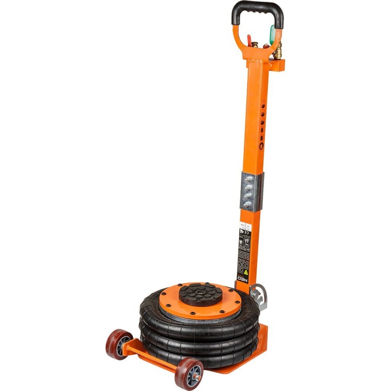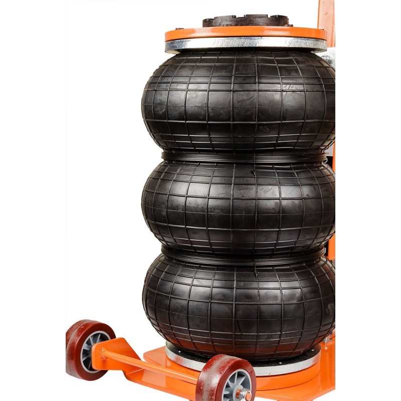 Pneumatischer Heber, maximale Tragkraft 3 t, Höhenbereich 145–420 mm, Durchmesser des Zylinders 270 mm, Betriebsdruck 6–12 bar, Gesamtgewicht 16,5 kg, zwei Rollen im Lieferumfang enthalten, Stahlkonstruktion.