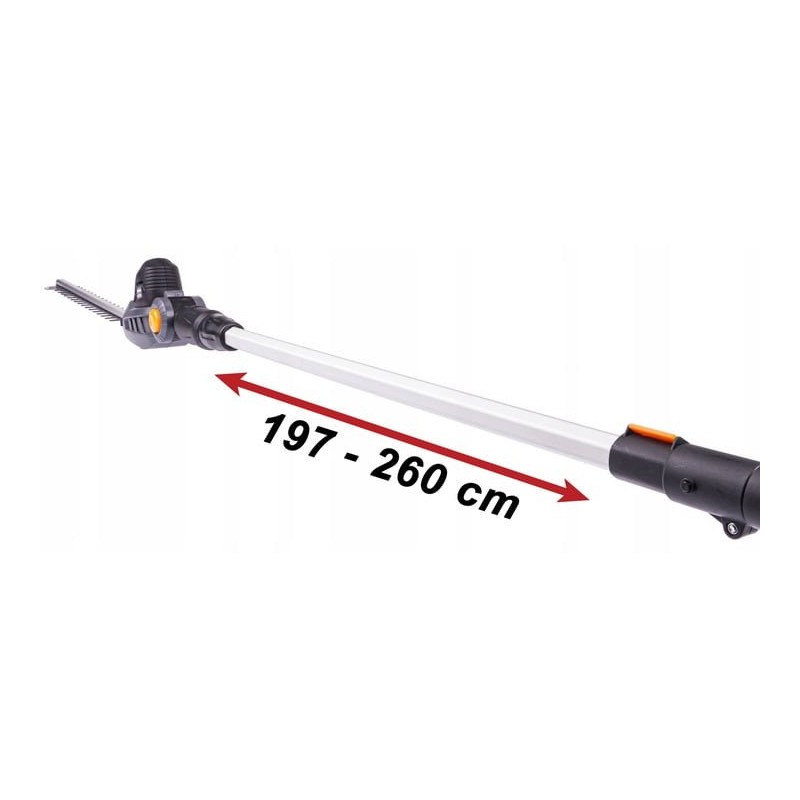 Der Teleskoparm lässt sich von 197 cm bis 260 cm verstellen, wodurch das Werkzeug an unterschiedliche Arbeitsbedingungen angepasst werden kann. So erreicht der Benutzer mühelos schwer zugängliche Stellen, was die Gartenarbeit erheblich erleichtert.