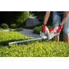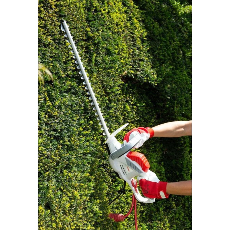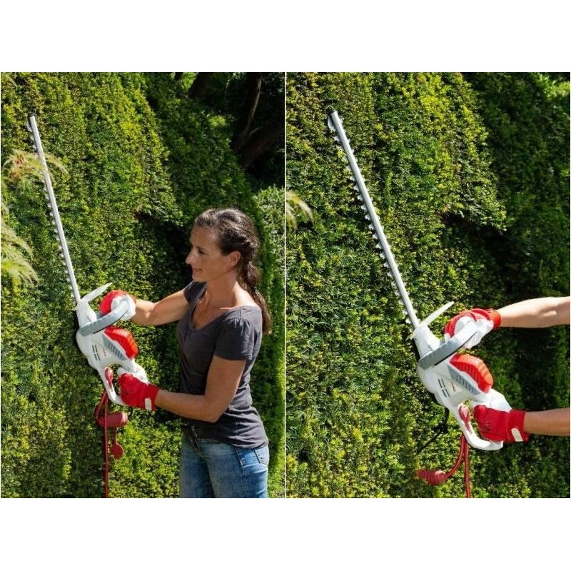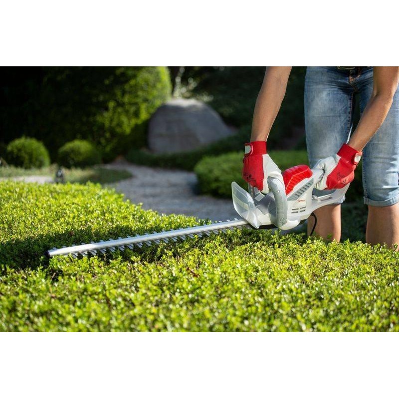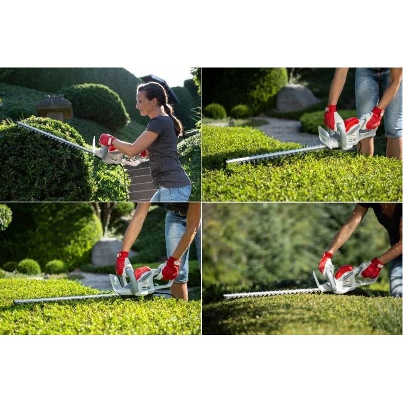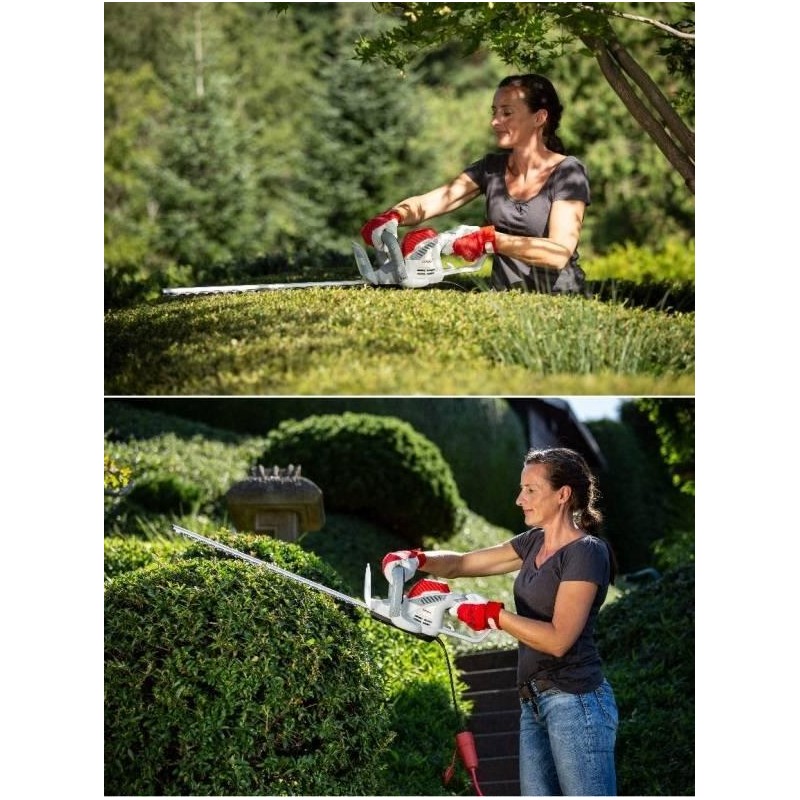 Mit elektrischen Heckenscheren lässt sich effizient und kontinuierlich arbeiten, da die Energie kontinuierlich aus der Steckdose zugeführt wird. Dank der externen Energiequelle sind elektrische Heckenscheren deutlich leichter als benzinbetriebene Heckenscheren. Die Energieversorgung über die Steckdose bedeutet auch, dass Sie nicht auf die Ladezeit des Akkus achten müssen. Es entstehen auch keine Arbeitsunterbrechungen durch das Befüllen des Tanks und das Anmischen des Kraftstoffs. Die elektrische Heckenschere IHT 550 verfügt über ein Metallgetriebe, das für Zuverlässigkeit und Langlebigkeit des Geräts sorgt. Bei Hecken, die an einer Mauer wachsen, müssen Sie sich keine Sorgen machen, dass ein Aufprall der Messerspitzen auf die Mauer die Schere beschädigt, da diese mit einer an der Spitze angebrachten Messerschutzkappe ausgestattet ist. Dadurch wird die Schere bei Kontakt der Messerspitzen mit der Mauer nicht beschädigt und ein Zurückschlagen der Schere durch die sich bewegenden Messer verhindert. Die Schutzvorrichtung an den Messerspitzen erfüllt drei wichtige Funktionen: Sie schützt den Bediener vor dem Zurückschlagen der Schere, schützt die Messer vor Beschädigung und schützt die Mauer vor Beschädigung.