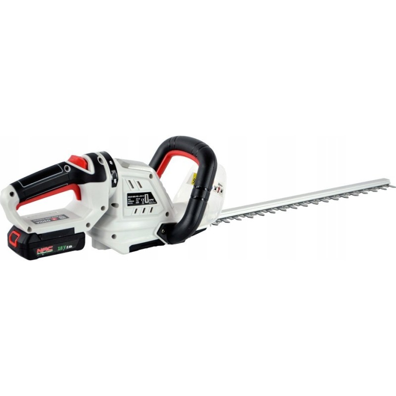 Akku-Heckenschere und Strauchschere der Firma NAC. Das Modell mit der Bezeichnung HB18-B20-45-L-RH-S ist mit einem modernen Lithium-Ionen-Akku mit einer Spannung von 18 V und einer erhöhten Kapazität von 2 Ah ausgestattet.
