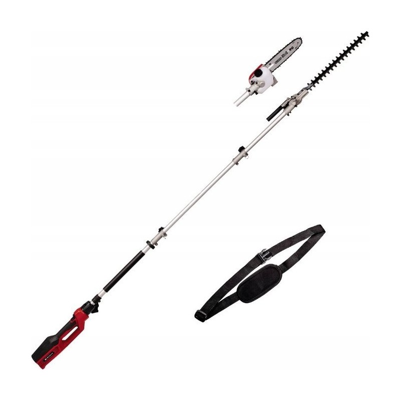 Ein praktisches 2-in-1-Gerät zum Schneiden hoher Hecken und Äste. Ausgestattet mit einer Teleskop-Heckenschere und einer Kettensäge ermöglicht es schnelles Schneiden dank der 46 cm langen Heckenschere mit einer Schnittlänge von 41,2 cm und der OREGON-Kettensäge mit einer Schnittlänge von 18 cm. Dank des großen Zahnabstands (20 mm) und der lasergeschnittenen, diamantgeschliffenen Klingen ist das Schneiden dicker Äste kein Problem. Die hohe Kettengeschwindigkeit (bis zu 11 m/s) sorgt für effizientes Schneiden, während die automatische Kettenschmierung und der Ölbehälter (100 ml) für einen unterbrechungsfreien Betrieb sorgen. Das Gerät ist 1,97 m lang und kann auf 2,60 m verlängert werden. Ein robustes Metallgetriebe garantiert eine lange Lebensdauer. Die Schere lässt sich in 11 Positionen neigen, und der hintere Griff ist drehbar. Für Arbeitskomfort sorgen weiche Griffe und ein verstellbarer Gurt mit Schnellverschluss. Die Schneidklingen werden sicher in einer robusten, im Lieferumfang enthaltenen Schutzhülle aufbewahrt und transportiert.