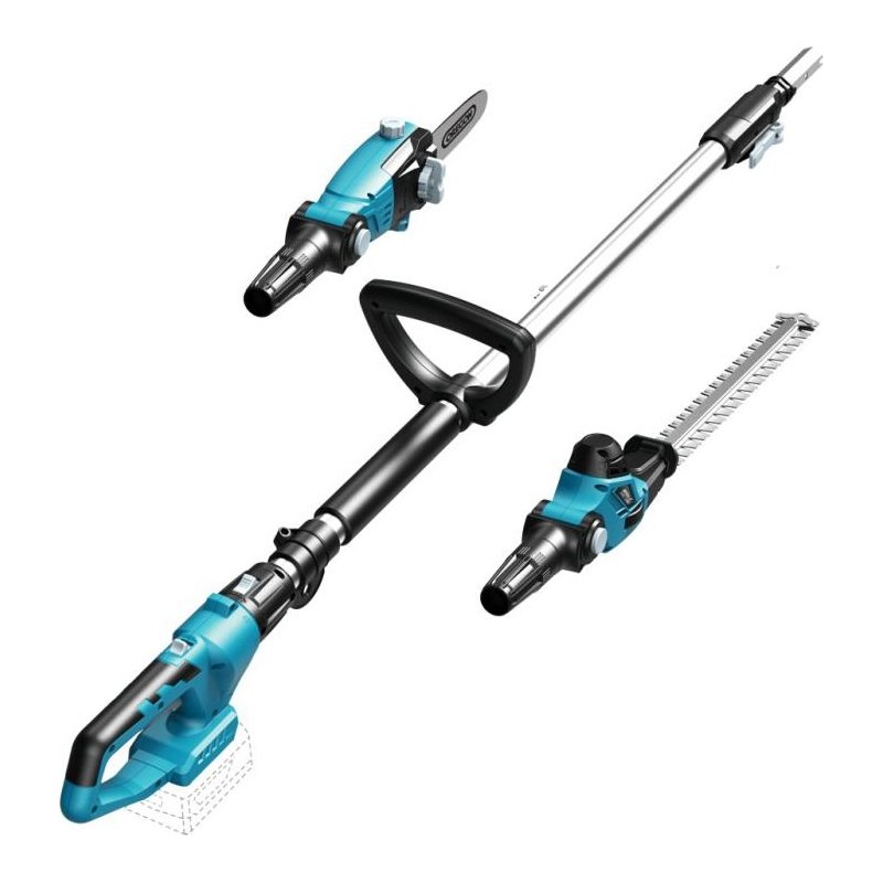 Zweifunktionsgerät bestehend aus einer Kettensäge und einer Heckenschere. Zur Verwendung mit SAS+ALL-Akkus.