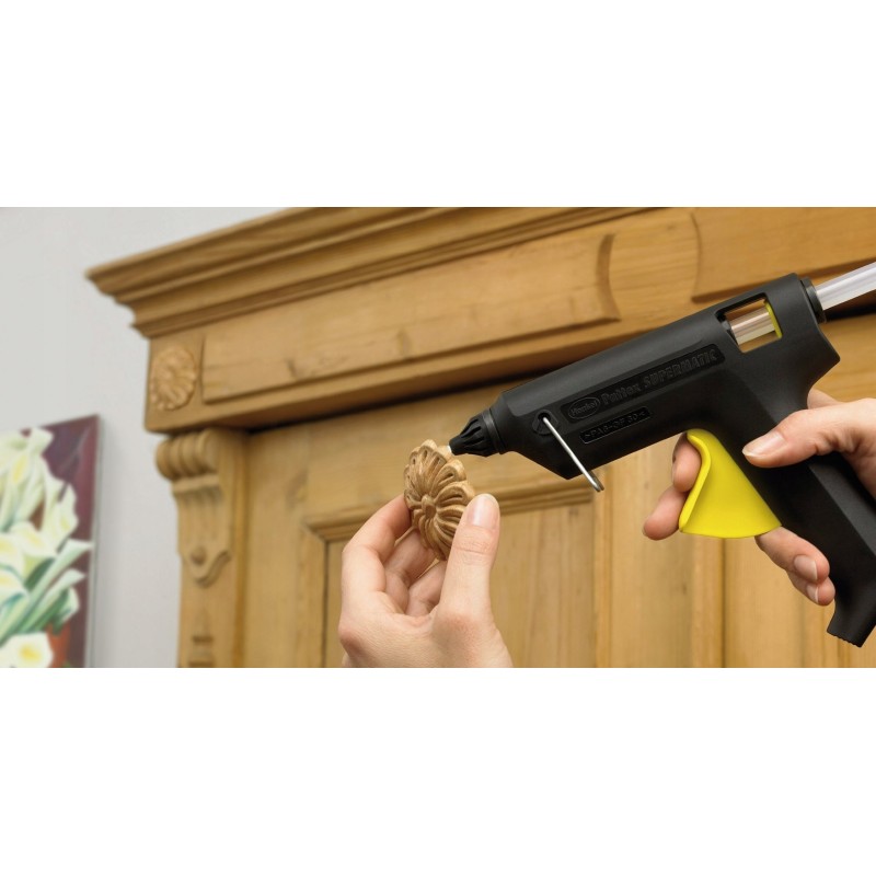 • Die Heißklebepistole Pattex Hotmelt Supermatic garantiert dank mechanischem Vorschub und Kartuschenhalter schnelles Auftragen des Klebers, starke Verklebung und leichteres Arbeiten