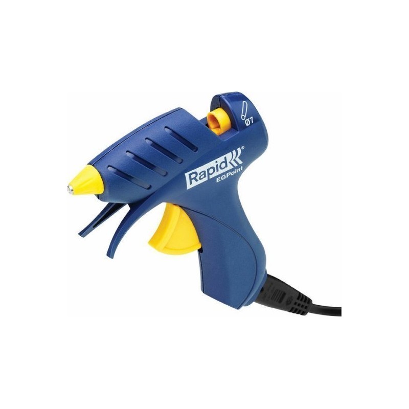 Rapid EG Point. Produkttyp: Heißklebepistole, Produktfarbe: Blau, Gelb, Gehäusematerial: Acrylnitril-Butadien-Styrol-Copolymer (ABS), Metall. Klebstoffausstoß: 1,3 g/min, Durchmesser der Klebstoffpatrone: 7 mm. Stromversorgung: Wechselstrom, Eingangsspannung AC: 220–240 V. Produktbreite: 45 mm, Produkttiefe: 180 mm, Produkthöhe: 200 mm. Aufheizzeit: 5 min, Leistung: 80 W