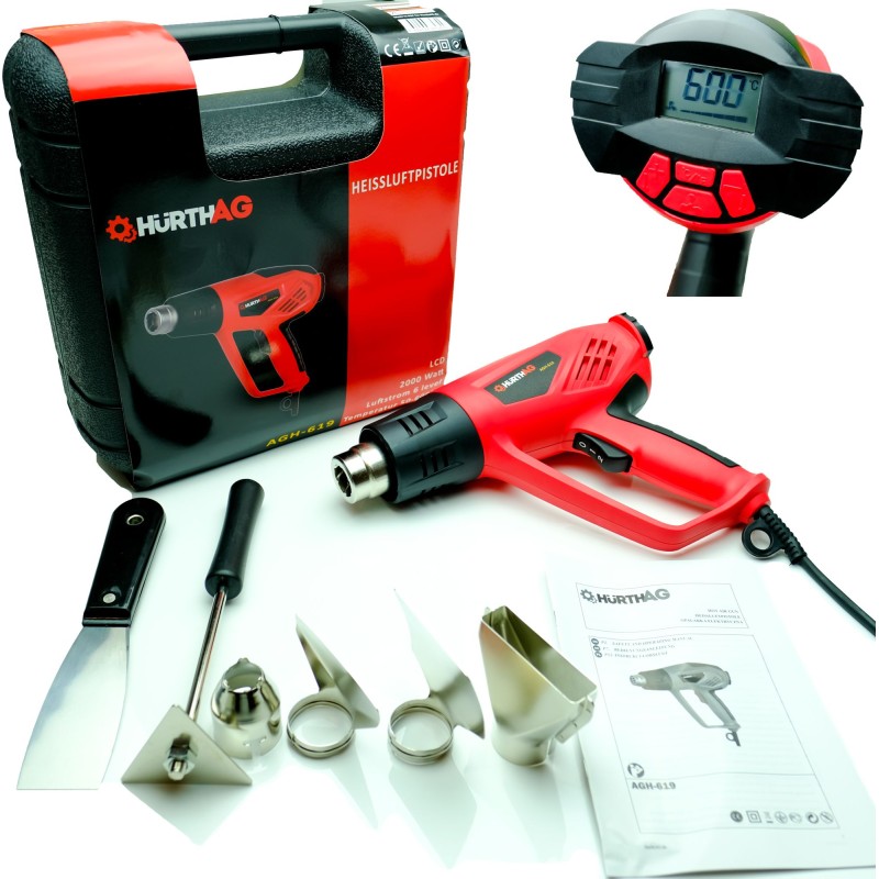 Die Heißluftpistole ist ein sehr leichtes Gerät, das zum Trocknen, Auftauen, Entfernen von altem Lack, Anbringen von Kantenbändern, Schrumpfen von Schrumpfschläuchen usw. bestimmt ist. Das Gerät verfügt über eine sechsstufige Luftstromregelung sowie eine digitale stufenlose Temperaturregelung mit LCD-Display. Im Lieferumfang enthalten sind 4 Düsen, 2 Schaber sowie ein praktischer Koffer.