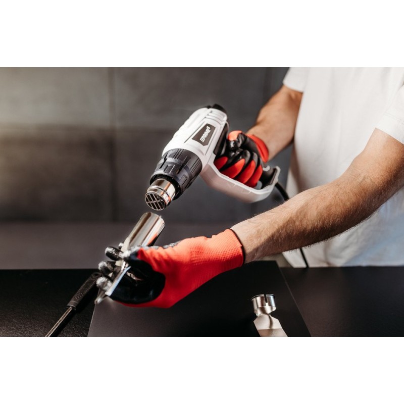 Die Heißluftpistole PRIME3 THG51 zeichnet sich durch eine ergonomische Bauweise und ein geringes Gewicht von nur 0,75 kg aus. Dadurch verspüren Sie auch bei längerem Gebrauch keine Ermüdungserscheinungen. Die Metallkapsel des Heizelements sorgt für eine wirksame Wärmeisolierung, was das Verbrennungsrisiko minimiert, und ein zusätzlicher Überhitzungsschutz erhöht die Arbeitssicherheit.