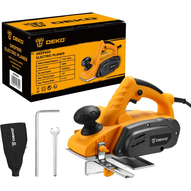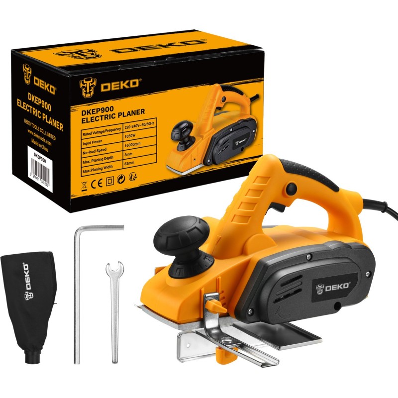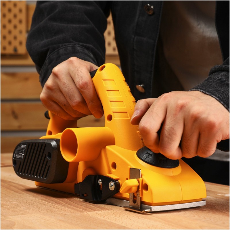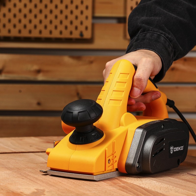 Die elektrische Hobelmaschine DEKO DKEP900 ist ein Gerät zur Holzbearbeitung, auch bekannt als elektrischer Hobel. Das Hobeln des Holzes erfolgt mithilfe von zwei Messern, die auf einer Walze befestigt sind, die von einem 900-W-Motor angetrieben wird. Der elektrische Hobel ist eines der grundlegenden Geräte für die Holzbearbeitung. Er findet sowohl im Hobbybereich als auch in Tischlereien Anwendung.