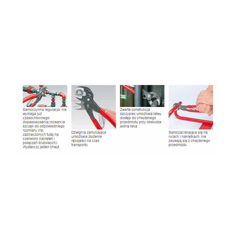 • Bei den SmartGrip®-Rohrzangen von KNIPEX erfolgt die Anpassung an die Größe des zu greifenden Objekts völlig automatisch! Einfach die Zange ansetzen, die Griffe zusammendrücken und fertig