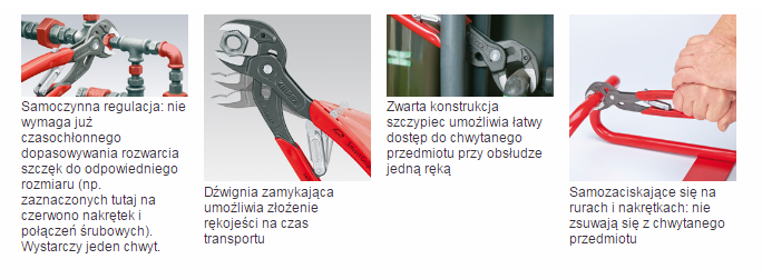 • Selbstklemmend an Rohren und Muttern: rutschen nicht vom Greifobjekt ab; erfordern nur geringen Kraftaufwand