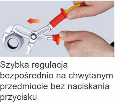 Die Anpassung des Greifbereichs der KNIPEX Cobra® VDE-Zange an das Werkstück erfolgt einfach und sicher: Nach dem Öffnen der Zange genügt es, die obere Backe auf das Werkstück zu setzen und die Zange zusammenzuschieben.