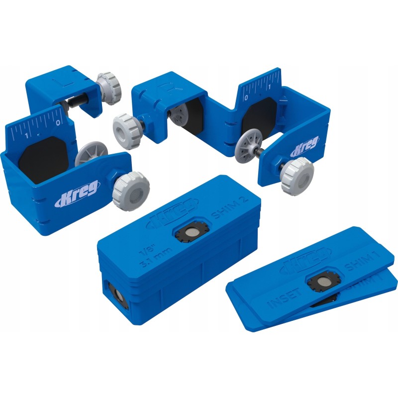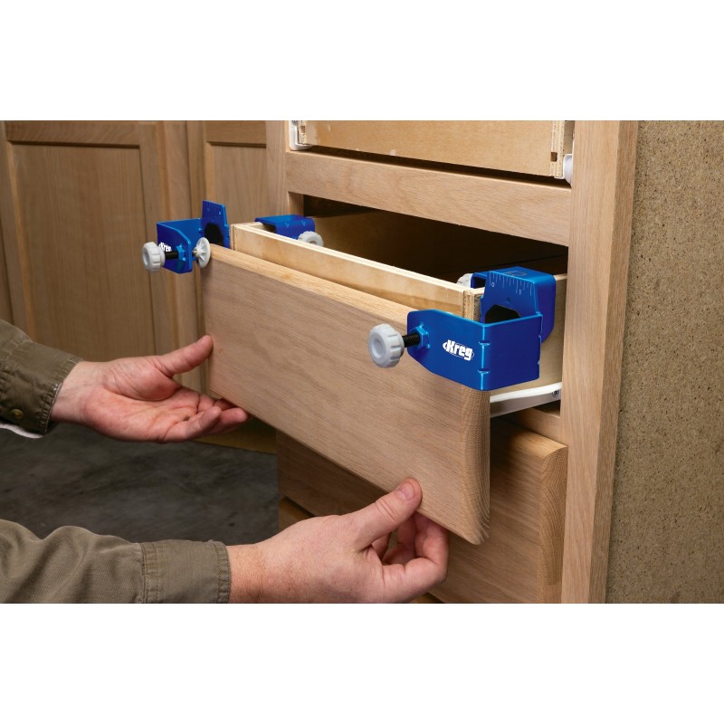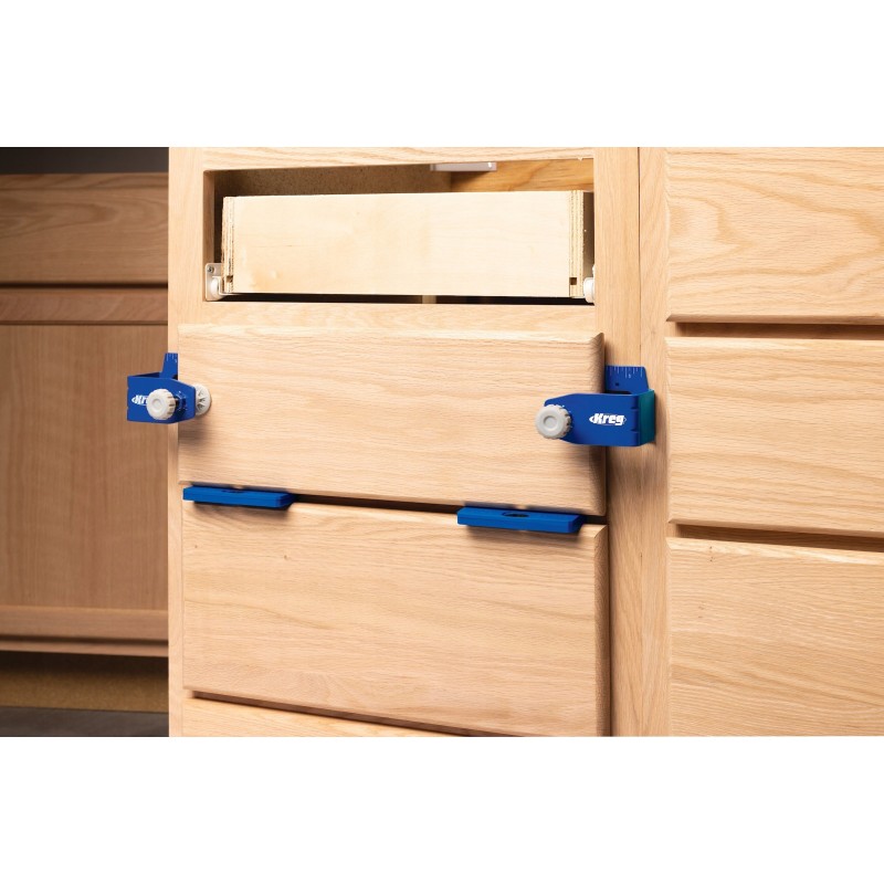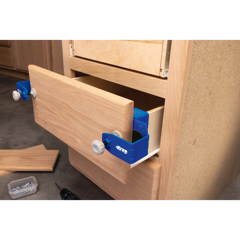 Praktisches Montage-Set für die zuverlässige Ausrichtung und Verschraubung von Schubladenfronten von Kreg.
