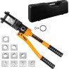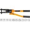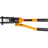 Hydraulische Handpresse zum Crimpen von elektrischen Kabelschuhen und Stahlseilen, Größe der Pressbacken: 16, 25, 35, 50, 70, 95, 120, 150, 185, 240, 300 mm, Länge 480 mm, Sechskant-Klemmtyp, Presskraft 12 Tonnen, Hub 20 mm, Gehäuse aus Kohlenstoffstahl, ausgestattet mit: geteilter Pressmatrize, drehbarem Zylinderkopf, Anschlagbolzen zur Arretierung der Matrizen, Kolben, Hauptventil des Zylinders, ergonomischen Griffen, beweglichem Zylinderarm.