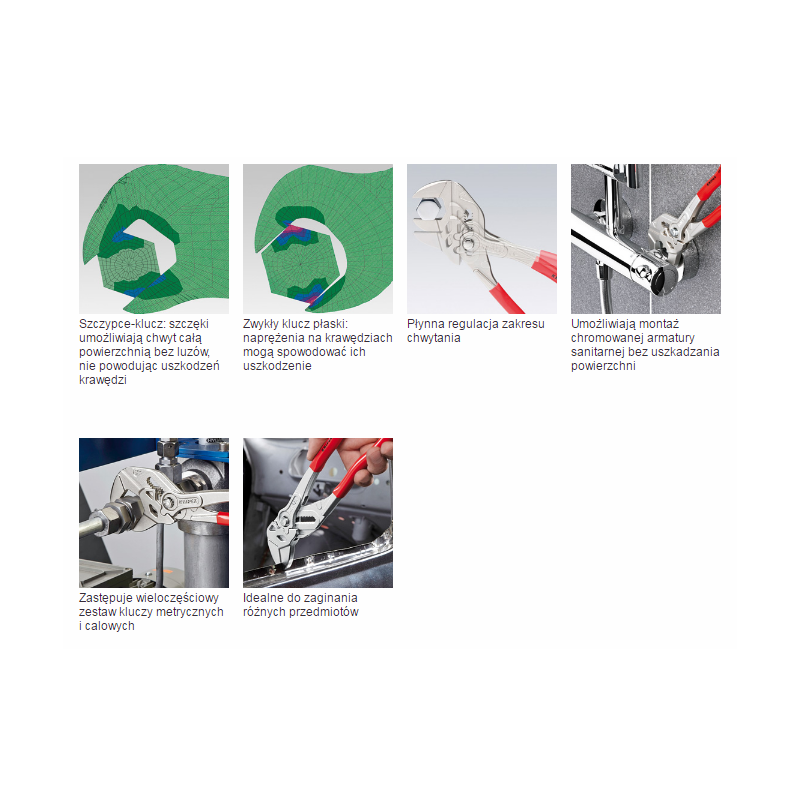 • Bei Bedarf greifen die glatten Backen alle parallelen Flächen innerhalb ihres Greifbereichs mit großer Kraft, was der Zange nahezu unbegrenzte Einsatzmöglichkeiten bietet: z. B. zum Anziehen von Schrauben, zum Andrücken von mit Kontaktklebern verbundenen Teilen, zum Abbrechen von Kanten bei Fliesenarbeiten, zum Lösen von Kabelbindern sowie als kleiner Schraubstock
