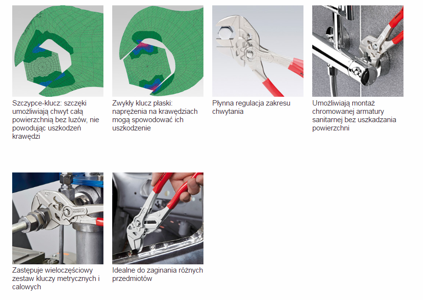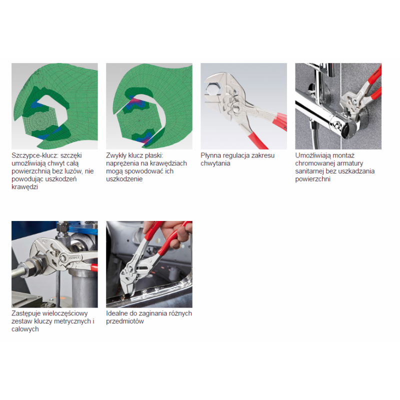 • Bei Bedarf greifen die glatten Backen alle parallelen Flächen innerhalb ihres Greifbereichs mit großer Kraft, was der Zange nahezu unbegrenzte Einsatzmöglichkeiten bietet: z. B. zum Festziehen von Schrauben, zum Andrücken von mit Kontaktklebern verbundenen Bauteilen, zum Abbrechen von Kanten bei Fliesenarbeiten, zum Lösen von Schlauchschellen sowie als kleiner Schraubstock.