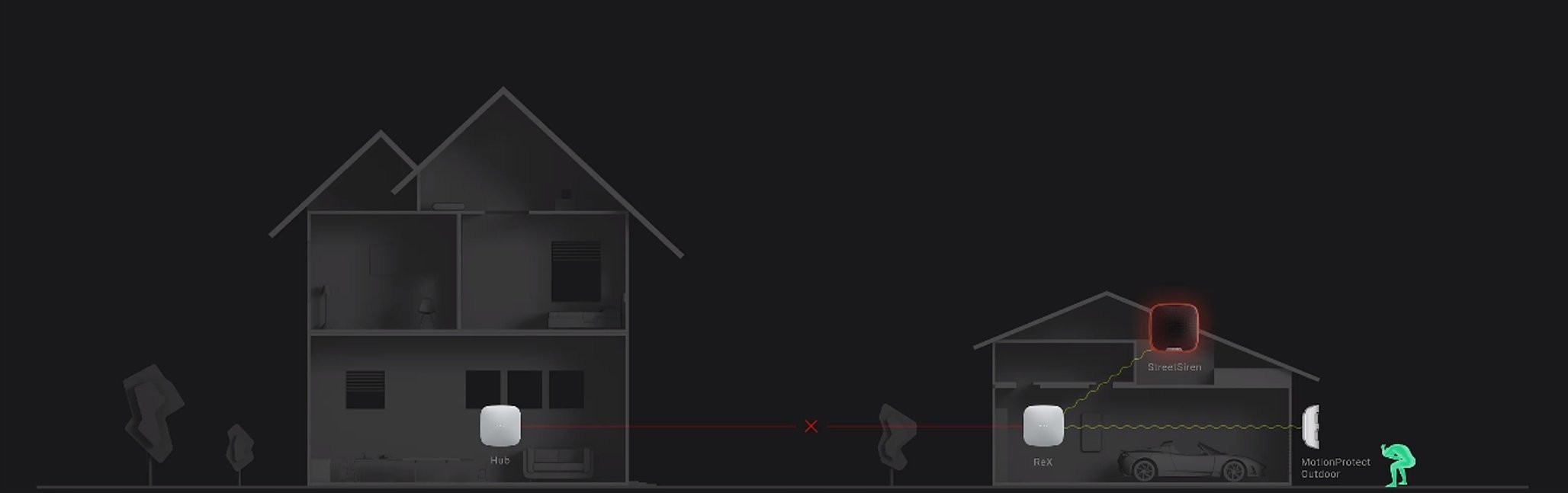 Reichweitenverstärker erweitern die Grenzen des geschützten Bereichs und ermöglichen eine flexible Anordnung der Alarmsystemgeräte. Durch den Anschluss aller oder eines Teils der Geräte1 an den ReX 2 können wir die Sicherheit und Automatisierung eines Geschäftszentrums, einer großen Immobilie, eines Lagerkomplexes oder einer großen Produktionsstätte gewährleisten.