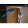 Das Werkzeug zur Montage von Schubladenführungen besteht aus zwei Halterungen, die sich im Inneren des Schranks festklemmen – eine auf jeder Seite – und sich an der Frontrahmenleiste des Schranks (oder an den Markierungen bei rahmenlosen Schränken) ausrichten, um die Schubladenführung beim Bohren der Befestigungslöcher zu stützen.
