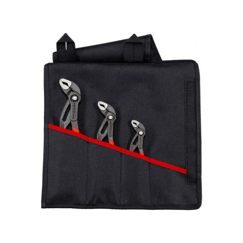 Technische Daten: Art.-Nr.: 00 19 55 S8EAN: 4003773086529Gewicht: 820 gAbmessungen: 330 x 115 x 35 mmKNIPEX Cobra® sind die legendären und technologisch fortschrittlichen verstellbaren Rohrzangen von KNIPEX. Der extrem starke Selbstspannmechanismus ermöglicht müheloses Arbeiten und verhindert ein Abrutschen des Werkzeugs von den Werkstücken. Jetzt als Set in verschiedenen Größen, in einer aufrollbaren Tasche und mit passendem Stickmotiv erhältlich.Jedes Set enthält drei technologisch fortschrittliche verstellbare Rohrzangen in verschiedenen Größen mit schlanken, kunststoffbeschichteten Griffen. Die Zangen verfügen über einen sehr robusten Selbstklemmmechanismus und ein ausgeklügeltes System zur präzisen Einstellung per Knopfdruck. Das Set enthält: 1 x KNIPEX Cobra® Rohrzangen der neuen Generation1 x KNIPEX Cobra® Rohrzangen der neuen Generation1 x KNIPEX Cobra® Rohrzangen der neuen Generation**Illustrative Fotos....