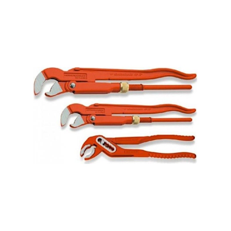 Komplett als Gesenkpressteil aus gehärtetem Chrom-Vanadium-Stahl gefertigt, mit verstärkter Hülse und geschliffenen Backen mit perfekten Abmessungen; 3-Punkt-Befestigung, selbstsichernd, zuverlässiger und fester Griff und Halt, auch bei Rohren mit glatten Oberflächen. Verrutschen wird durch die passende, induktionsgehärtete Verzahnung verhindert. Das Set enthält: 1-Zoll-Steckschlüssel, 1½-Zoll-Steckschlüssel, 10-Zoll-Verstellschlüssel „SP“.**...