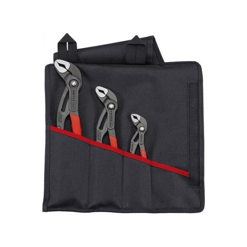 Technische Daten: Art.-Nr.: 00 19 55 S9 EAN: 4003773086536 Gewicht: 1.255 g Abmessungen: 330 x 115 x 35 mm KNIPEX Cobra® sind die legendären und technologisch fortschrittlichen verstellbaren Rohrzangen von KNIPEX. Der extrem starke Selbstspannmechanismus ermöglicht müheloses Arbeiten und verhindert ein Abrutschen des Werkzeugs von den Werkstücken. Jetzt als Set in verschiedenen Größen, in einer aufrollbaren Tasche und mit passendem Stickmotiv erhältlich.Jedes Set enthält drei technologisch fortschrittliche verstellbare Rohrzangen in verschiedenen Größen mit schlanken, kunststoffbeschichteten Griffen. Die Zangen verfügen über einen sehr robusten Selbstspannmechanismus und ein ausgeklügeltes System zur präzisen Einstellung per Knopfdruck. **Illustrative Fotos....