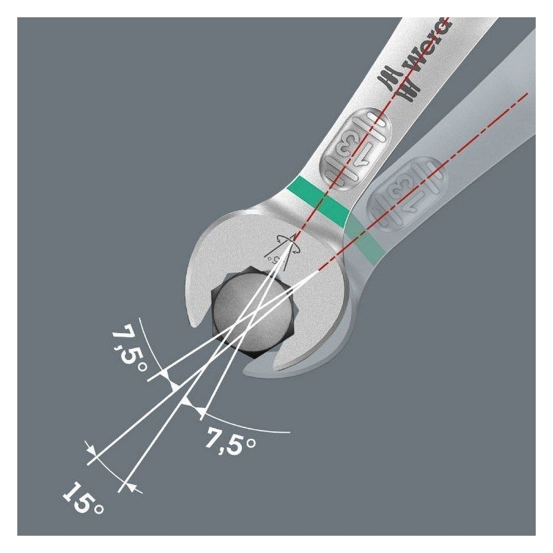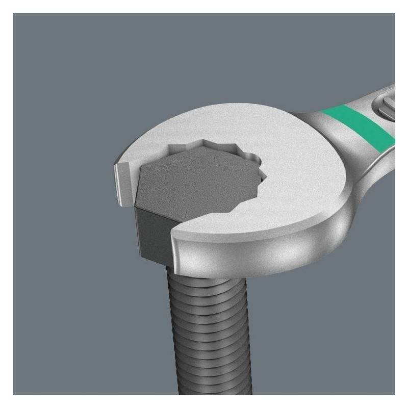 • Der Schraubenschlüssel verfügt über einen Anschlag, der ein Abrutschen vom Schraubenkopf verhindert und die Übertragung hoher Drehmomente ermöglicht.