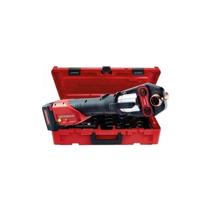 Technische Daten: Abmessungen: 445 x 125 x 75 mm Gewicht: ca. 3,6 kg (ohne Backen) Spannkraft: 32 kN Backen: Profilbreite 33 mm, Spannstift 14 mm Arbeitsbereich: 12 – 110 mm (systemabhängig)Kopf: um 270° drehbarStromversorgung: 18-V-Li-Ionen-Akku / 4,0 Ah oder 2,0 Ahoptional 230-V-Netzteil, 50–60 HzBetriebstemperatur: -10 °C bis +60 °CAkku-Lebensdauer: Bis zu 240 Klemmvorgänge (28 mm Edelstahl)Maximal unterstützte Durchmesser:Profil M – bis 54 mmProfil SV (V) – bis 110 mmProfil TH – bis 63 mmProfil U – bis 110 mmProfil G – bis 63 mmDie ROMAX 4000 ist eine schnelle, leichte, handliche und sichere Presszange. Ideal für den Einsatz auf der Baustelle.Produktmerkmale:Zuverlässig: Wartungsintervall bei 40.000 Pressvorgängen.Universell: Pressbacken anderer Hersteller passen.Schnell – Der Presszyklus dauert ca. 5 Sekunden. Der Kolben kehrt nach Abschluss des Vorgangs automatisch in die Ausgangsposition zurück. Sicher – CFT® garantiert die erforderliche Presskraft. Die automatische Prozessüberwachung sorgt dafür, dass der Kolben in die Ausgangsposition zurückkehrt, sobald die zum Pressen erforderliche Kraft erreicht ist. Eine Sicherheitsverriegelung verhindert das versehentliche Lösen der Backen. Leicht – außergewöhnlich leicht und gut ausbalanciert. Robust und wirtschaftlich – dank der hohen Qualität beträgt die Wartungsintervall 20.000 Pressvorgänge. Dies gewährleistet einen kontinuierlichen, wirtschaftlichen Betrieb. Hoher Betriebstemperaturbereich – die ROMAX 4000 arbeitet problemlos unter schwierigen Bedingungen. Das Klemmen ist in einem Temperaturbereich zwischen -10 °C und +60 °C möglich. Leistungsstarker Akku – Der serienmäßige 18-V-Li-Ion-Akku mit 4,0 Ah ermöglicht 240 Klemmvorgänge (28 mm Edelstahl) mit einer Akkuladung. Ohne Memory-Effekt und Leistungsverlust. Kältebeständig. Schnellladung mit AIR COOLED-Technologie. Praktisches Design – geeignet für schwer zugängliche Stellen. Im ROCASE-Koffer – das neue Koffersystem von Rothenberger: kombinierbar. LEDs erleichtern die Arbeit an dunklen Orten. Automatischer Rücklauf – nach Beendigung des Zyklus kehrt der Kolben in die Ausgangsposition zurück.Presswerkzeug ROMAX 4000, 18-V-Akku / 4,0 Ah Li-Ion, Schnellladegerät, ROCASE-Koffer.**...