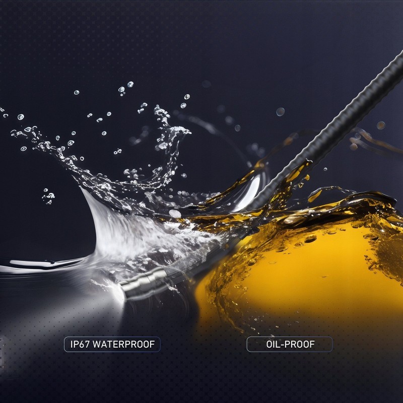 Das Gerät zeichnet sich durch eine Wasserdichtigkeit nach IP67 sowie Öl- und Chemikalienbeständigkeit aus, was es ideal für den Einsatz unter rauen Bedingungen macht.