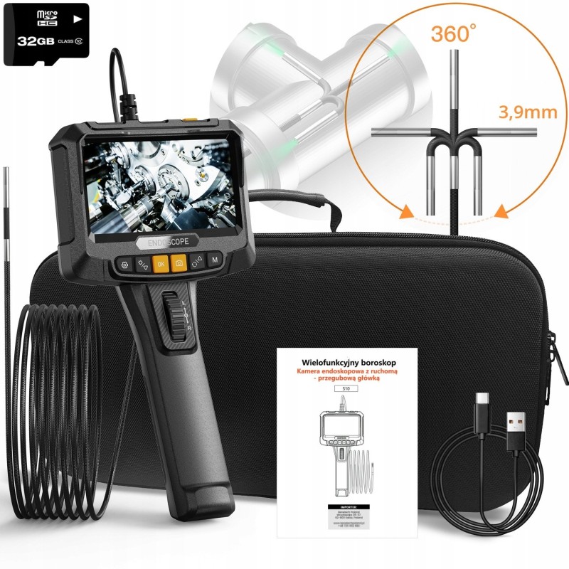 360°-Dreh-Inspektionsendoskop mit LED-Beleuchtung, 32-GB-SD-Karte, IP67-zertifiziert, 1 m Kabel, 3,9-mm-Kamera
