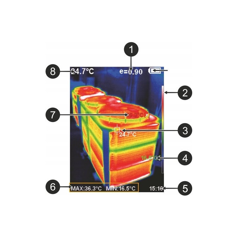 Ausgestattet mit einem 2,8-Zoll-TFT-Display mit einer Auflösung von 320 x 240 ermöglicht die Kamera ein einfaches Ablesen der Messergebnisse. Der große Bildschirm sorgt für eine komfortable Anzeige der aufgezeichneten Daten.