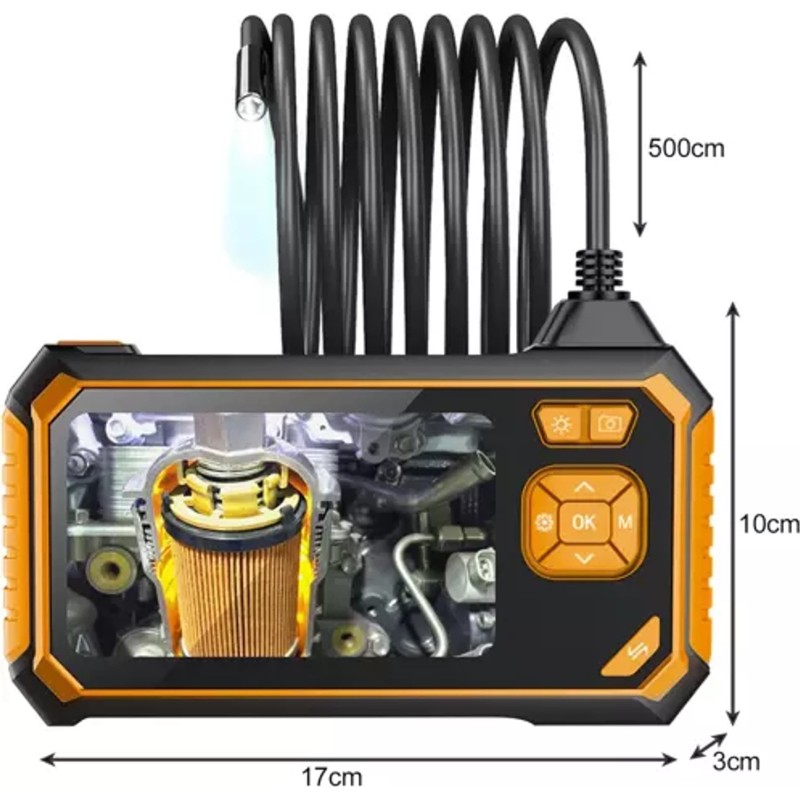 • TECHNISCHE DATEN – 4,3" LCD-Endoskop für Foto und Video in FULL HD; Lupe: 8 mm; Kabellänge: 5 m; Pixelanzahl: 2 Millionen Pixel; Wasserdichtigkeit: IP67; Akkukapazität: 1700 mAh; Ladezeit: 1,5 Std.; Betriebsdauer: 3 Std.; Abmessungen: 17 x 10 x 3 cm; Gewicht: 492 g; Gewicht mit Verpackung: 616 g.