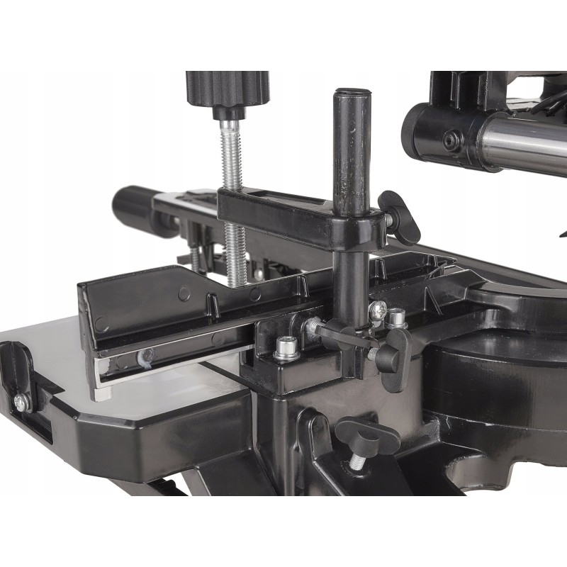 Ein weiterer Vorteil der Säge ist die ausziehbare Arbeitsplatte, die das Arbeiten mit Materialien unterschiedlicher Größe ermöglicht. Die Säge verfügt über eine Klemme, mit der das zu schneidende Material sicher fixiert werden kann.