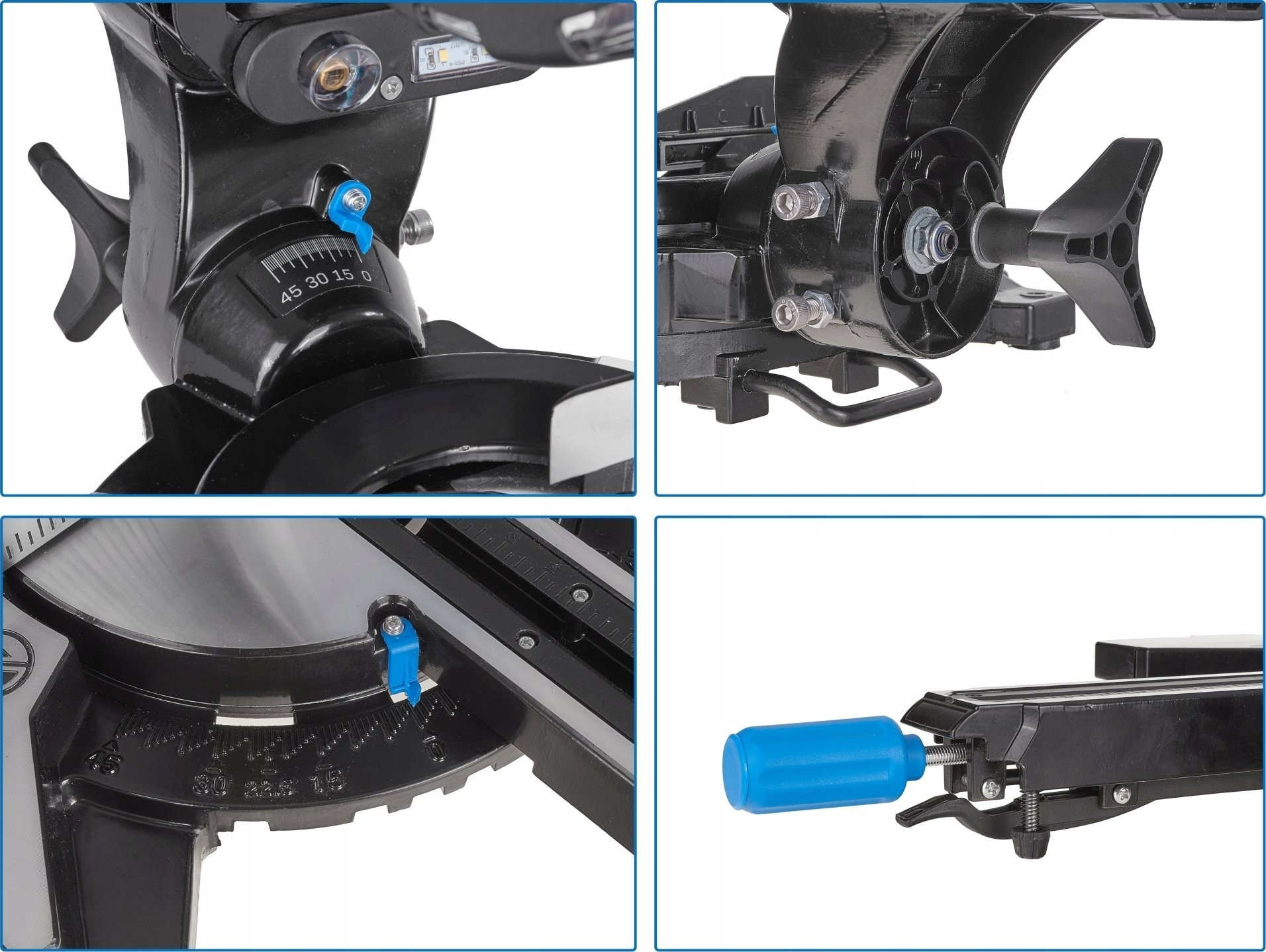 Dank des drehbaren Sockels aus robustem Aluminiumdruckguss ermöglicht das Gerät Gehrungsschnitte in jedem beliebigen Winkel im Bereich von -45°/ 0 / 45°. Die zusätzliche Neigungsverstellung des Sägeblatts ermöglicht das Schneiden von Material in einem Winkel von 0° bis 45°.