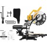 Das Sägen besonders großer Werkstücke wird durch ausziehbare Seitenstützen erleichtert, und zwei verstellbare Klemmen halten das Werkstück fest. Der Sägekopf gleitet auf einer festen Rohrführung, wobei die Bewegung des Schlittens arretiert werden kann.