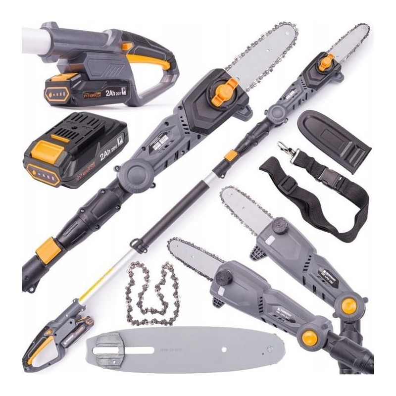 Elektrische Ausleger-Kettensäge mit vierstufiger Neigungsverstellung der Marke POWERMAT PM-APW-20C mit hochwertiger Führungsschiene und Kette der Profimarke OREGON. Die Möglichkeit der schnellen und einfachen Längenverstellung des Auslegers im Bereich von 172 cm bis 240 cm sowie die vierstufige Neigungsverstellung des Sägekopfes erleichtern das Beschneiden von Bäumen erheblich. Der 20-V-Akku-Elektromotor (2 Ah) ermöglicht dank seiner Leistungsreserven das Schneiden dicker Äste. Die Schienenlänge beträgt 20 cm und die Schnittlänge 18 cm. Die Säge ist aus hochwertigen Materialien gefertigt, was für gute Stabilität und damit für weniger Ermüdung bei der Arbeit sorgt. Die Säge verfügt über ein automatisches Kettenschmiersystem. Der Ölstand lässt sich leicht über eine transparente Anzeige überprüfen. Ein großer Vorteil der Säge ist ihr Gewicht von nur 3,25 kg. Die Kettengeschwindigkeit beträgt 5 m/s.