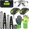 • Lieferumfang: 2x Akku, Netzladegerät, Führungsschiene, Kette, Schraubendreher, Handschuhe, Akku-Kettensäge, Koffer, Schutzbrille