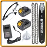 • Lieferumfang: 2x Kette, 2x Akku 4Ah, Schutzbrille, Einfülltrichter, Ladegerät, Führungsschiene