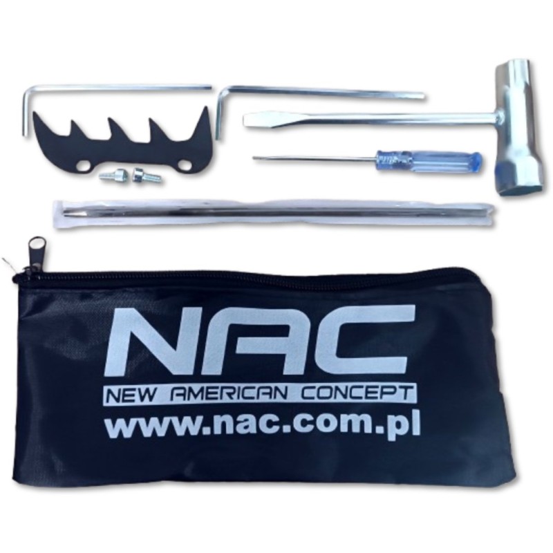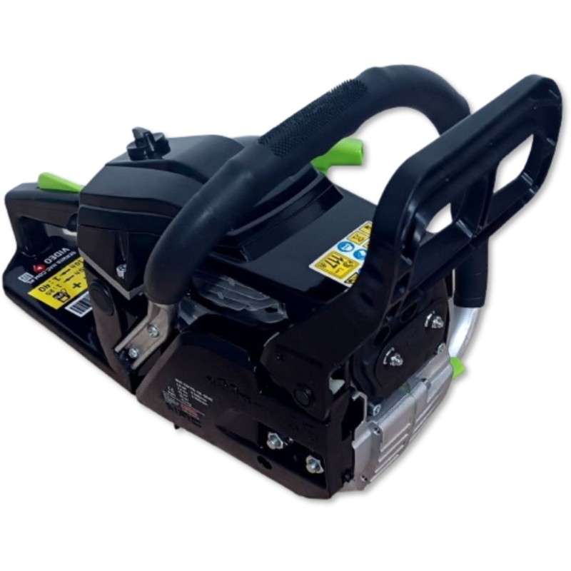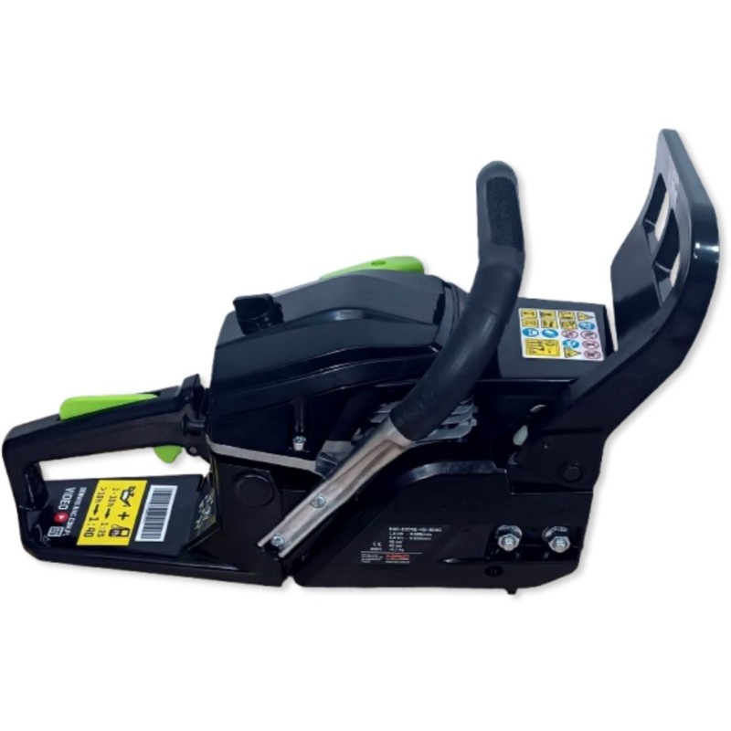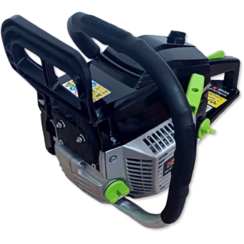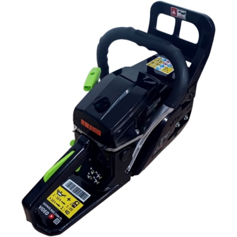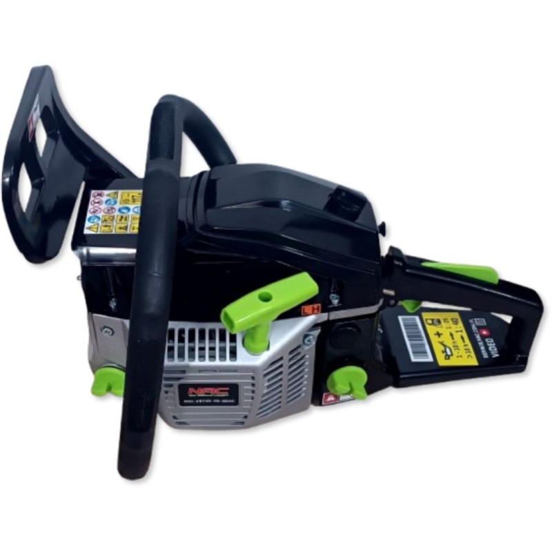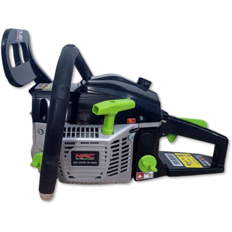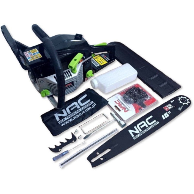 Benzin-Kettensäge der Marke NAC mit einem Zweitakt-Verbrennungsmotor, dessen Gehäuse aus Aluminiumguss gefertigt ist, mit einem Hubraum von 45 cm³ und einer Leistung von 1,6 kW. Das Gerät eignet sich ideal zum Schneiden von Brennholz und Gartenholz, zum Abtrennen von Ästen sowie für Bauarbeiten. Die Säge verfügt über ein automatisches Kettenschmiersystem, wodurch sie keine spezielle Wartung erfordert, was viel Zeit spart. Die Säge verfügt über einen profilierten, rutschfesten Griff für sicheren Halt, integrierte Stoßdämpfer für Komfort bei der Nutzung und einen gut ausbalancierten Schwerpunkt, sodass das Gerät den Benutzer auch bei längeren Arbeiten nicht ermüdet. Im Lieferumfang der Säge sind eine 40 cm (16") lange Führungsschiene, eine Low-Kick-Back-Kette, eine Kunststoffabdeckung für die Führungsschiene, ein Messbecher zum Mischen von Kraftstoff und Öl, eine Aufbewahrungstasche für Werkzeuge, 2 Inbusschlüssel, ein Schraubendreher, eine Feile sowie ein Zündkerzenschlüssel mit Schraubendreher enthalten. In den ersten 10 Betriebsstunden sollte für die Säge ein Kraftstoffgemisch im Verhältnis 25:1 verwendet werden (100 ml Zweitaktöl auf 2,5 Liter Benzin), nach 10 Betriebsstunden sollte ein Gemisch im Verhältnis 40:1 verwendet werden (100 ml Zweitaktöl auf 4 Liter Benzin).