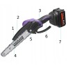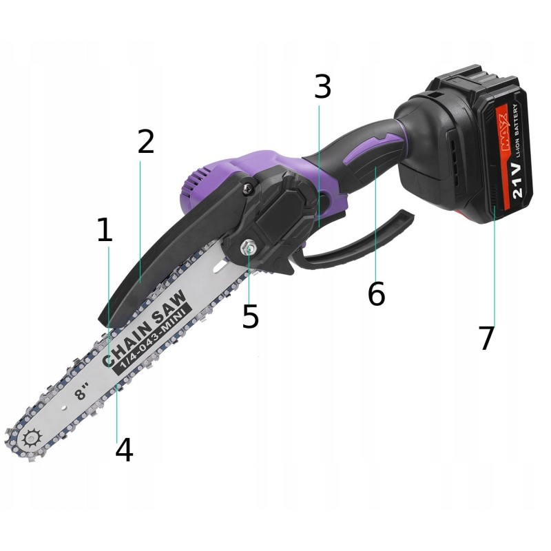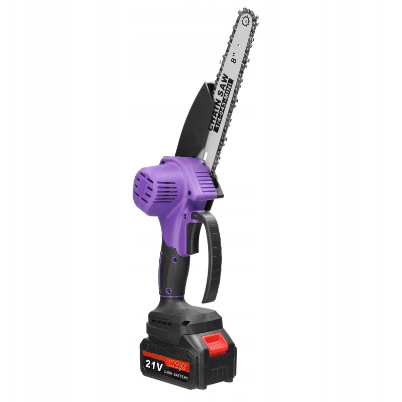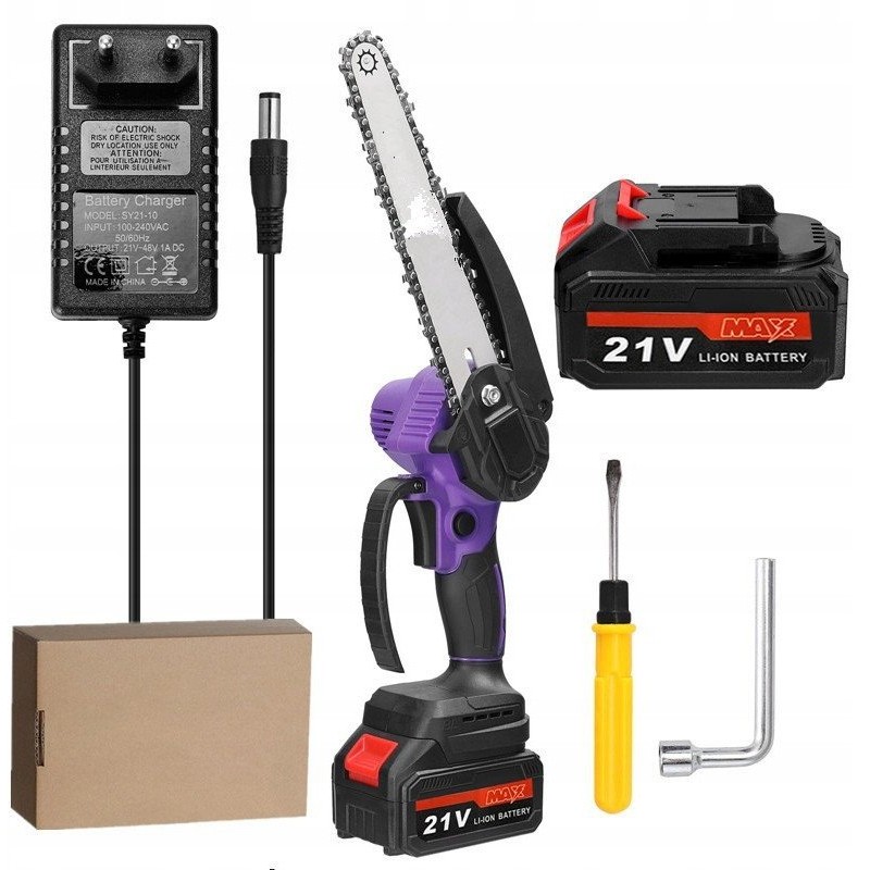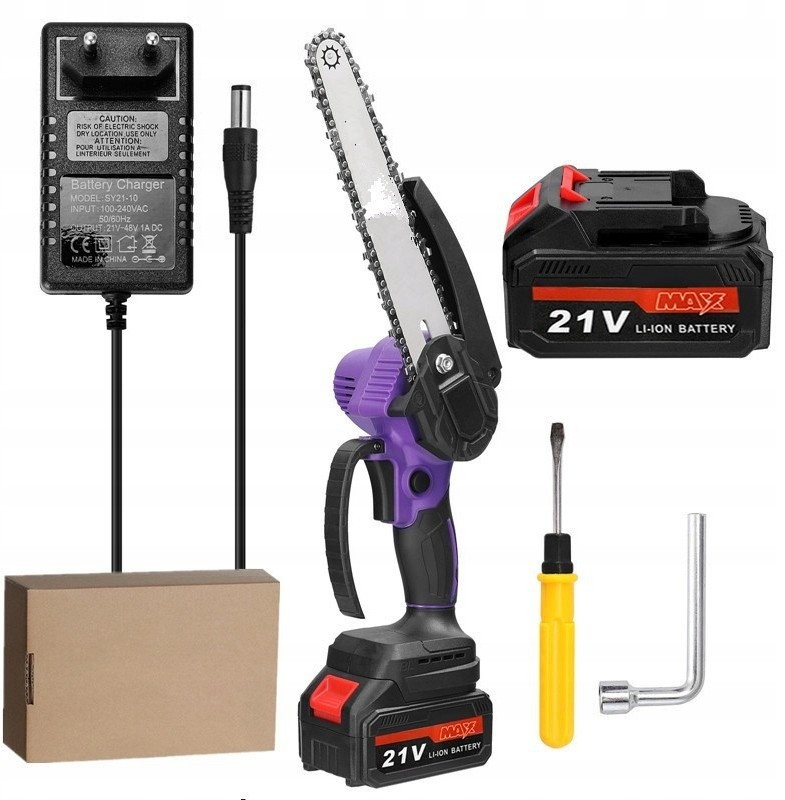• Lieferumfang: Kettensäge, Kette mit 8-Zoll-Kopf, 2x Akku, Ladegerät, Splitterschutz, Schraubendreher, Schlüssel, Bedienungsanleitung in polnischer Sprache.