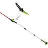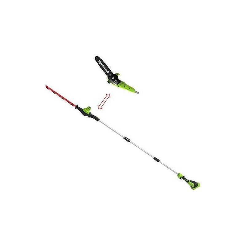 Ein multifunktionales Gerät, das eine Kettensäge und eine Heckenschere in sich vereint. Ausgestattet mit einer 20 cm langen Führungsschiene, einer 51 cm langen Schere und einem 3-teiligen Ausleger (bis zu 2,4 m Höhe) ermöglicht es das bequeme Schneiden von Ästen und hohen Hecken.