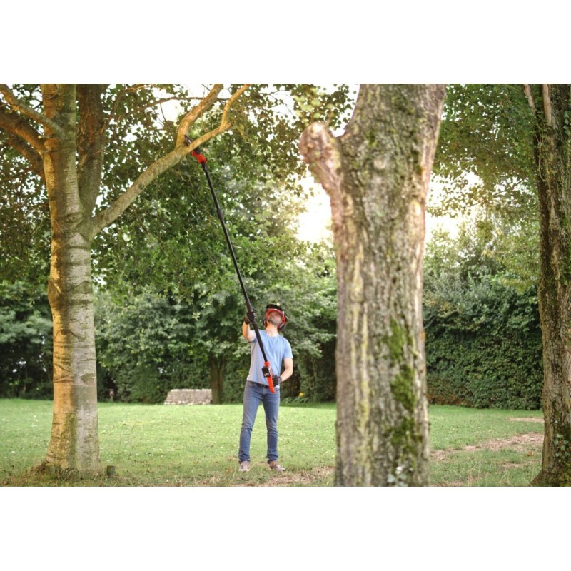 Die Säge wiegt nur 4,3 kg, was sie leicht und komfortabel in der Handhabung macht. Der 100 cm lange Teleskopstiel ermöglicht die Anpassung der Werkzeuglänge an die individuellen Bedürfnisse des Anwenders, und der verstellbare Schultergurt sorgt für zusätzlichen Komfort bei der Arbeit.