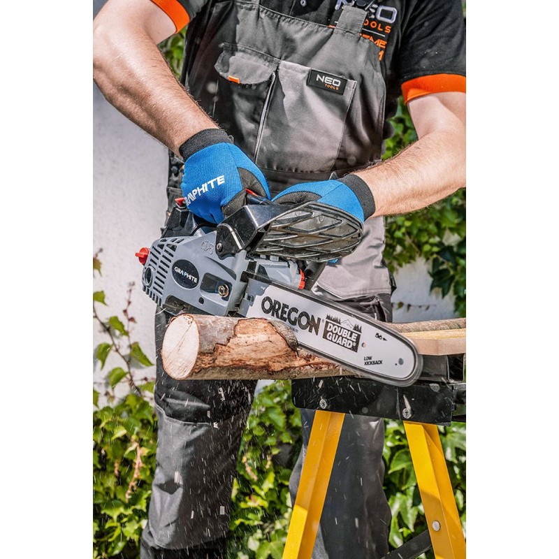 • Hochwertige Benzinkettensäge von GRAPHITE mit einem Motor mit einer Leistung von 2 kW/2,70 PS, konzipiert für das bequeme und schnelle Schneiden von Holz.