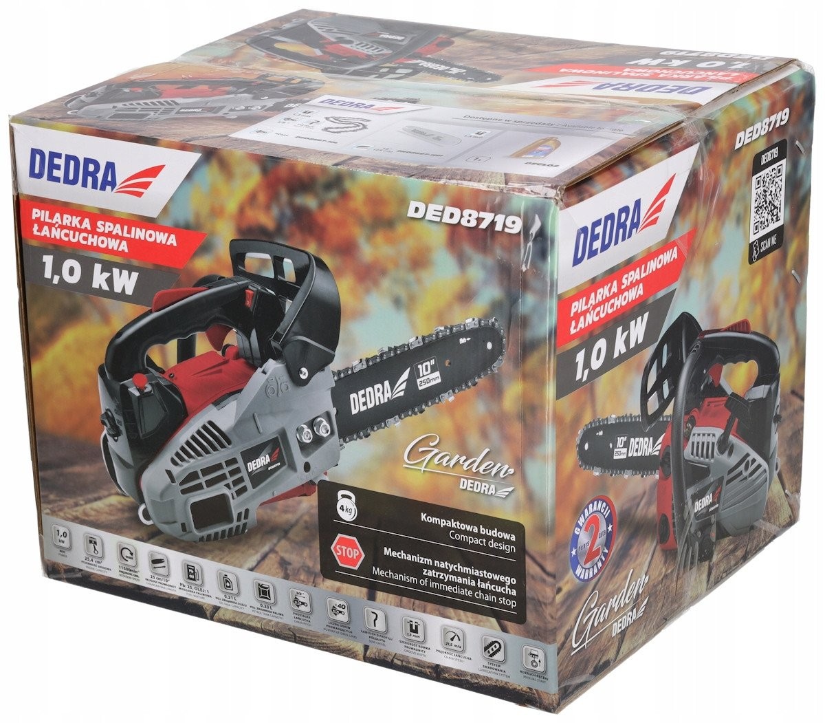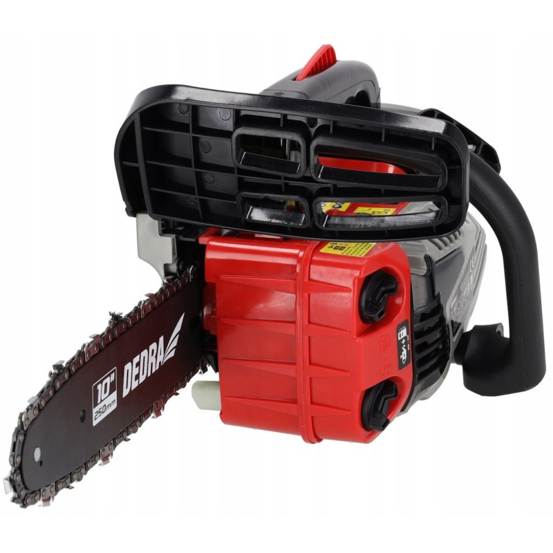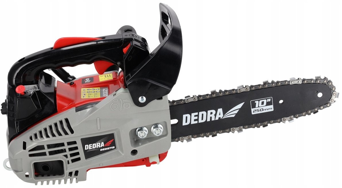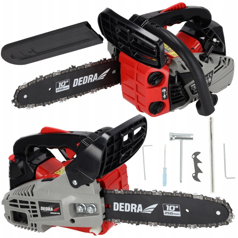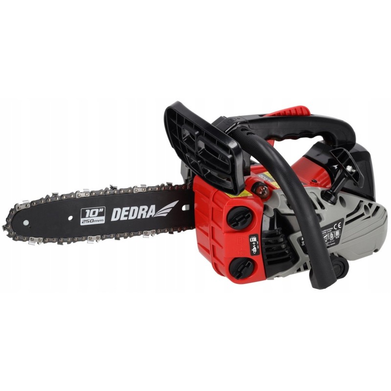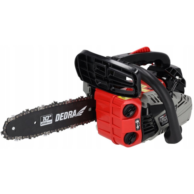 Ausgestattet mit einem Motor mit 25,4 cm³ Hubraum bietet die DEDRA-Kettensäge hervorragende Leistung und Arbeitseffizienz. Der luftgekühlte Zweitakt-Einzylindermotor garantiert eine lange Lebensdauer, und die maximale Drehzahl von 11.500 U/min sorgt für schnelles und problemloses Sägen.