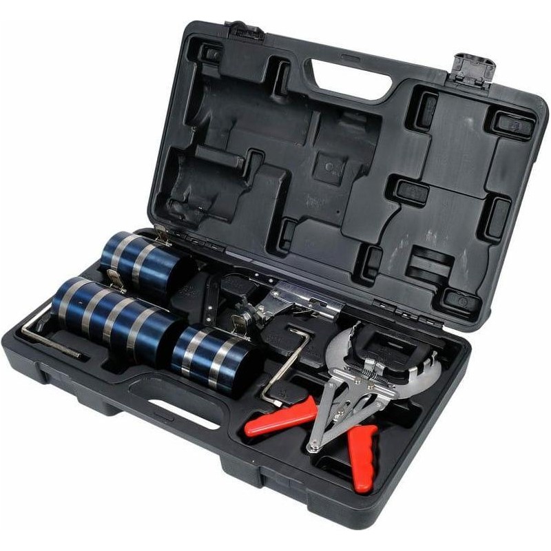 Professionelles Set für die Bearbeitung von Kolbenringen und Kolben. Enthält eine Zange zum Abnehmen und Aufsetzen von Kolbenringen, ohne dass die Gefahr einer Beschädigung der Teile besteht. Durch Zusammendrücken der Arme öffnet sich der Kolbenring, der von den seitlichen Backen gehalten wird, da sich die mittleren Backen öffnen. Durch Lösen des Drucks kann der Ring in die Nut um den Kolben eingesetzt werden. Werkzeug zum Reinigen der Kolbenrillen von angesammeltem Verbrennungsrückständen, ausgestattet mit drei Scheiben mit Schneiden. Die Anpassung der Schneide an den richtigen Kolbendurchmesser erfolgt durch Verschieben der Scheibe auf dem Flachstahl. Zusätzlich sind im Set 3 Kolbenring-Spannzangen enthalten. Dies sind unverzichtbare Werkzeuge für den sicheren Einbau von bestückten Kolben in den Motorzylinder. Die Spannzangen sind für folgende Kolbengrößen geeignet: 50–125 mm, 60–175 mm, 60–175 mm. Das gesamte Set umfasst 10 Teile, verpackt in einem praktischen Koffer.