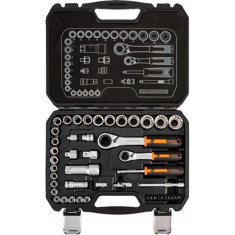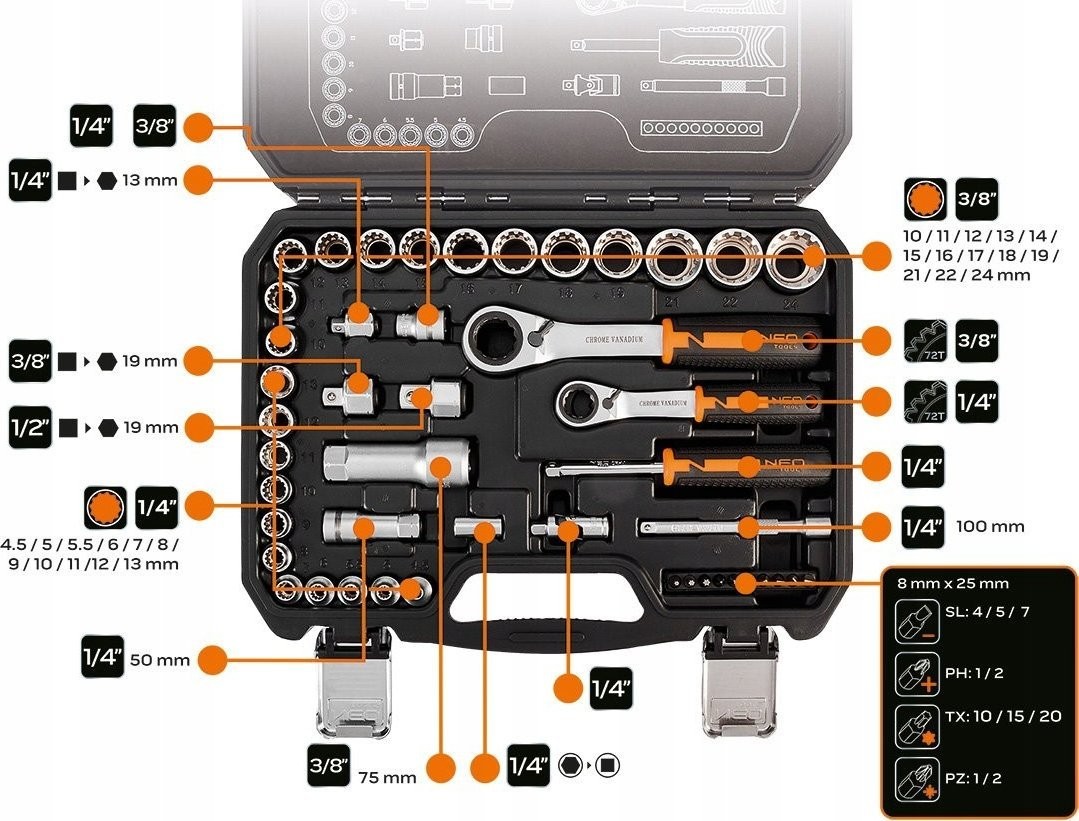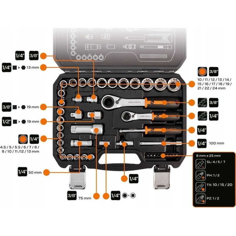 NEO Steckschlüsseleinsatz-Set 1/4" + 3/8", 46-teilig