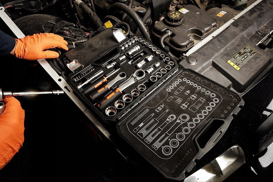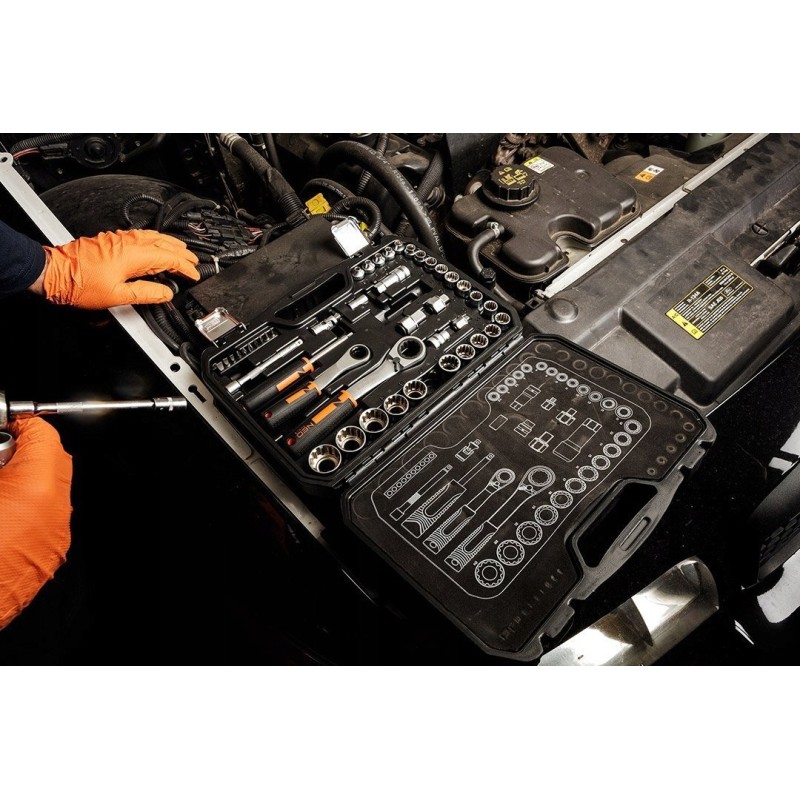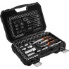 • Der praktische Koffer enthält 11 Stück 1/4"-Durchsteck-Steckschlüsseleinsätze in den Größen: 4,5, 5, 5,5, 6, 7, 8, 9, 10, 11, 12, 13 mm; eine 1/4"-Durchsteck-Ratsche; Drehgriff; 1/4"-Verlängerung 100 mm; 1/4"-Bitadapter; 1/4"-Universalgelenk; Schnellwechseladapter; Durchgangsverlängerung; Bithalter; 10 Bits in den Größen: PH1, PH2, PZ1, PZ2, SL4, SL5, SL7, TX10, TX15, TX20; 13 Stück Durchgangssteckschlüsseleinsätze 3/8" in den Größen: 10, 11, 12, 13, 14, 15, 16, 17, 18, 19, 21, 22, 24 mm; Durchgangsverlängerung 75 mm; Durchgangsratsche 3/8"; Adapter für 3/8" 19 mm sowie Adapter für 1/2" 19 mm.