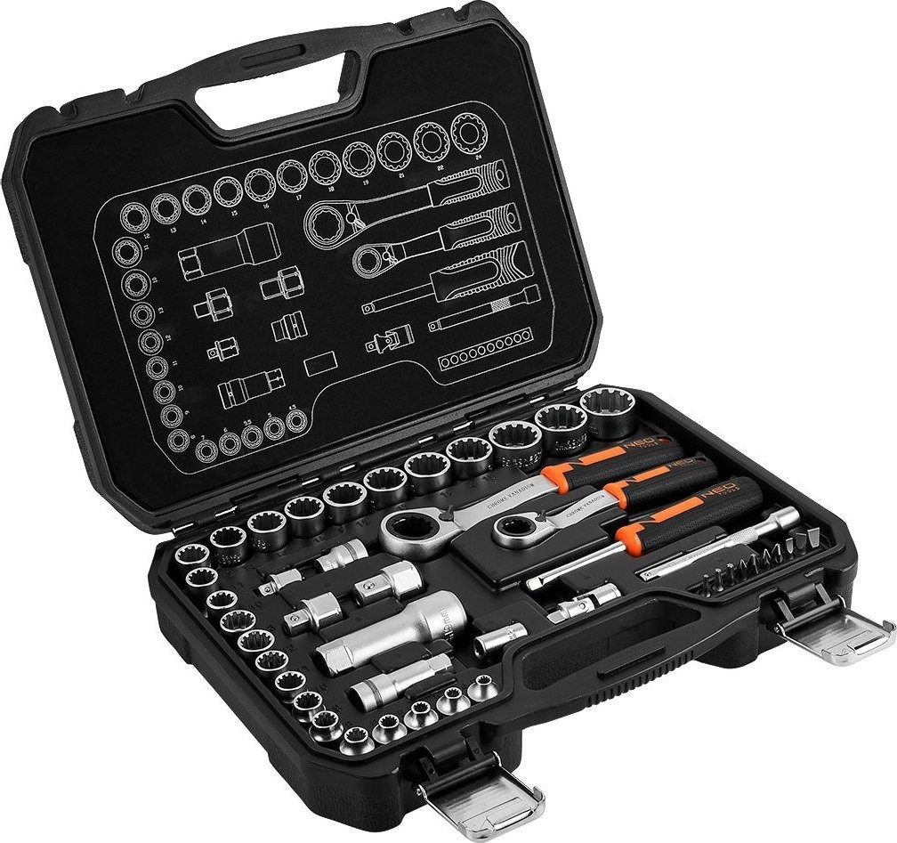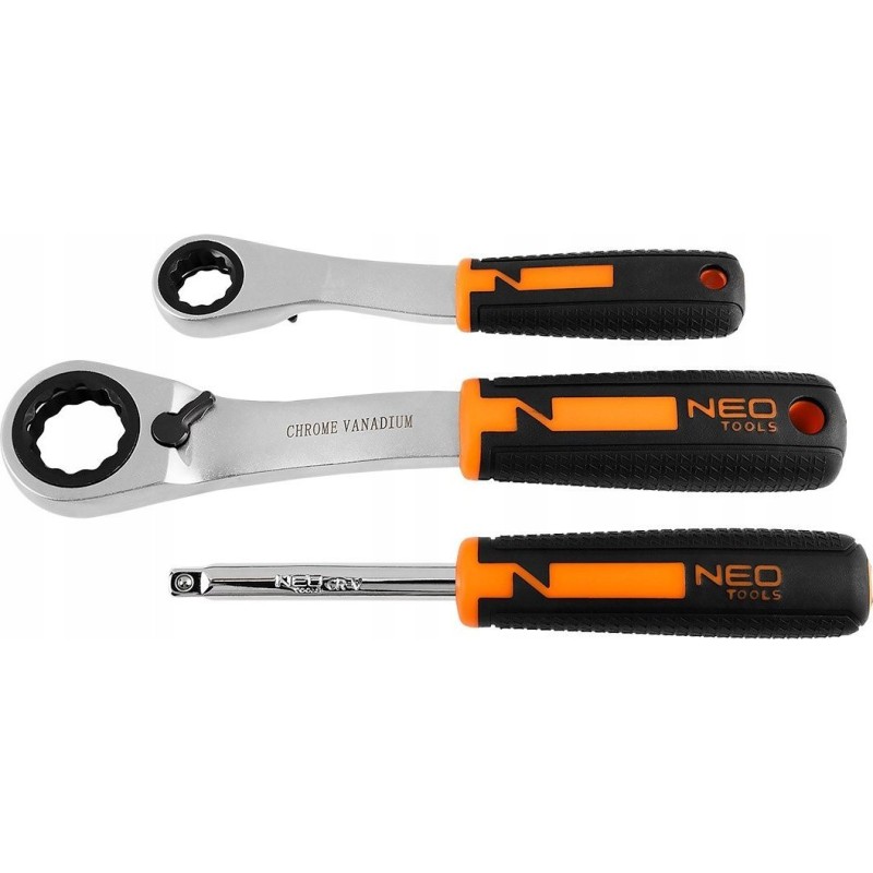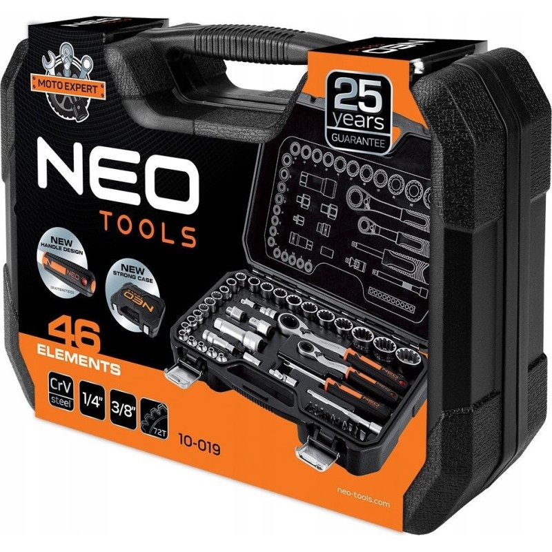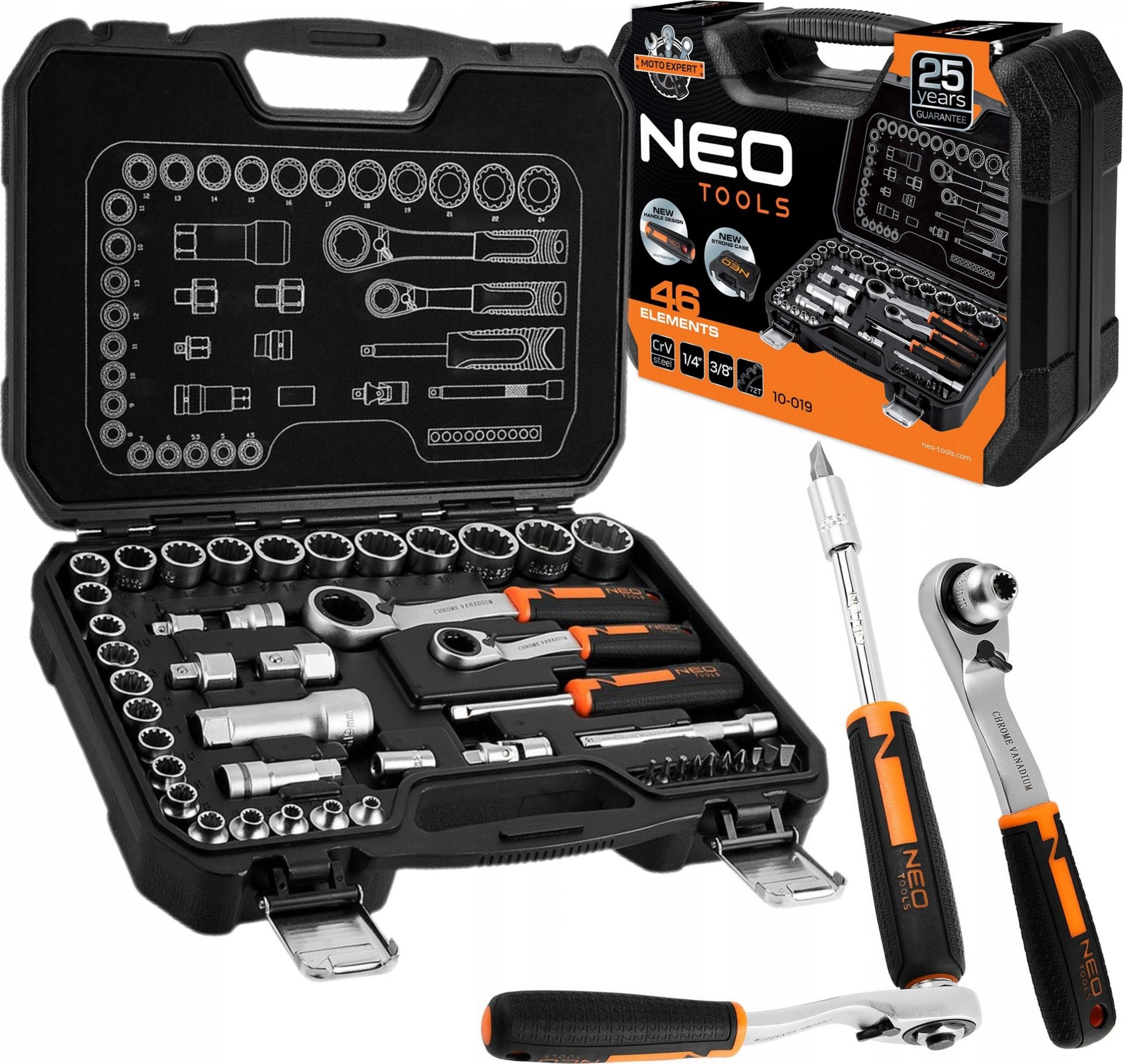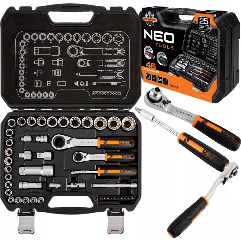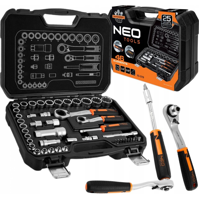 • Der Durchsteck-Steckschlüsselsatz 10-019 der Marke NEO TOOLS ist eine Kollektion von 1/4" + 3/8" Durchsteck-Steckschlüsseln, die 46 verschiedene Teile umfasst.