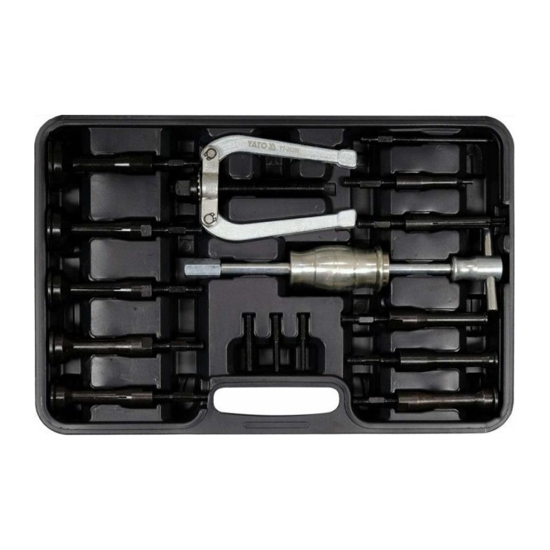 Technische Daten:Marke: YatoArtikelnummer: YT-25390Serie: GRDMaterial: Kohlenstoffstahl #45Anwendung: für innenliegende Kugel- und NadellagerArbeitsbereich: 8–58 mmAnzahl der Teile im Set: 15Set mit Trägheitsabziehern für innenliegende Buchsenlager und Laufringe. Geeignet für Führungslager, Nadellager und andere Bauteile, die einen Innenabzieher erfordern. Das Set wird u. a. für Lager verwendet, die am hinteren Ende der Kurbelwelle sitzen und die Kupplungswelle abstützen. Der Satz dient zum Ausziehen von Lagern, Außenlaufringen und Buchsen mit einem Durchmesser von 8 bis 58 mm.Setinhalt: Schwunghammer – Abzieher | Lageraufsätze x10 (8–11 mm, 12–17 mm, 18–23 mm, 24–29 mm, 30–34 mm, 34–38 mm, 39–43 mm, 44–48 mm, 49–53 mm, 54–58 mm)|Zweischlägel|Lieferumfang, Fortsetzung: Reduzierstücke x5 (M10x1,5P, M10x1,5P/M8x1,25P, M10x1,5P/M6x1,0P)**Symbolfoto....