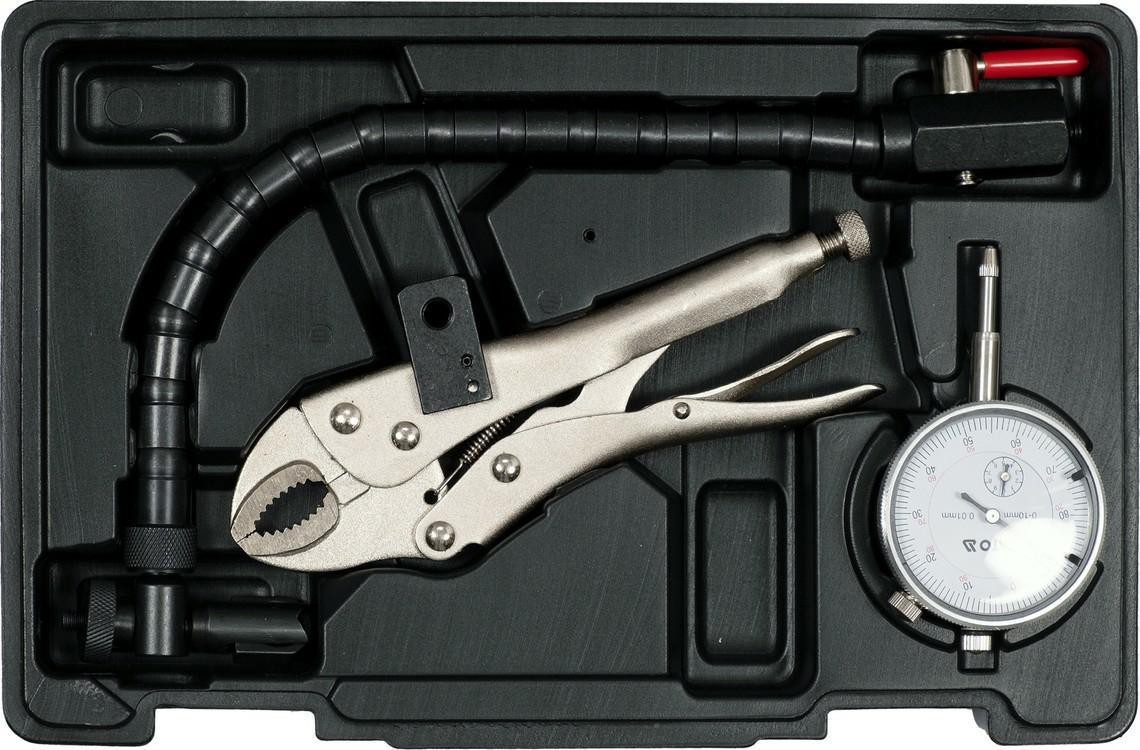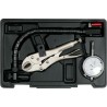 Set zur Überprüfung des Rundlaufs von Bremsscheiben: Messuhr mit einer Genauigkeit von 0,01 mm, Messbereich 10 mm, flexibles Arm mit Schraubarretierung, Spannvorrichtung.