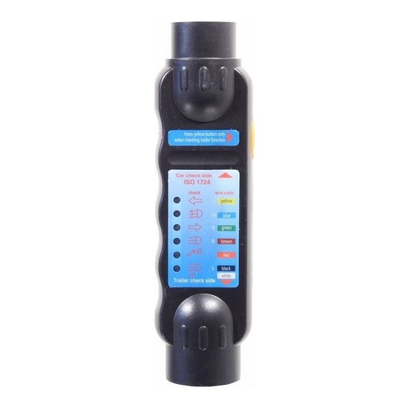 LED-Prüfgerät zur Überprüfung aller Beleuchtungsfunktionen der Anhängersteckdose des Fahrzeugs und des Anhängersteckers. Es prüft alle 7-poligen Steckdosen und Stecker; mit Hilfe von Adaptern (nicht im Lieferumfang enthalten) auch alle 13-poligen Steckdosen und Stecker im 7-poligen Modus. LEDs zeigen eine unterbrochene Verbindung an.